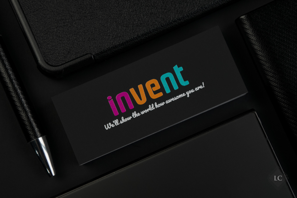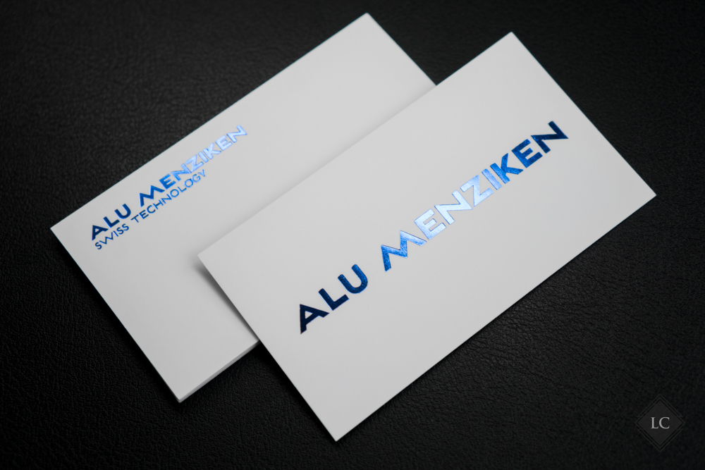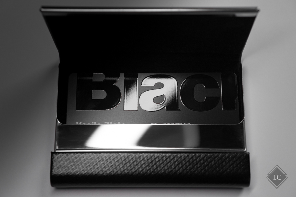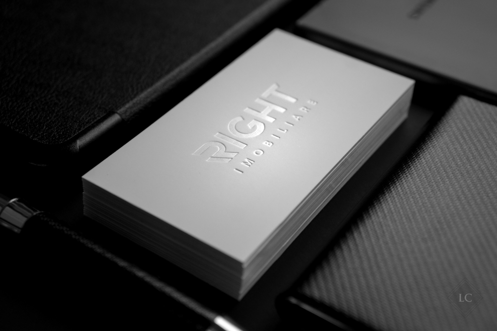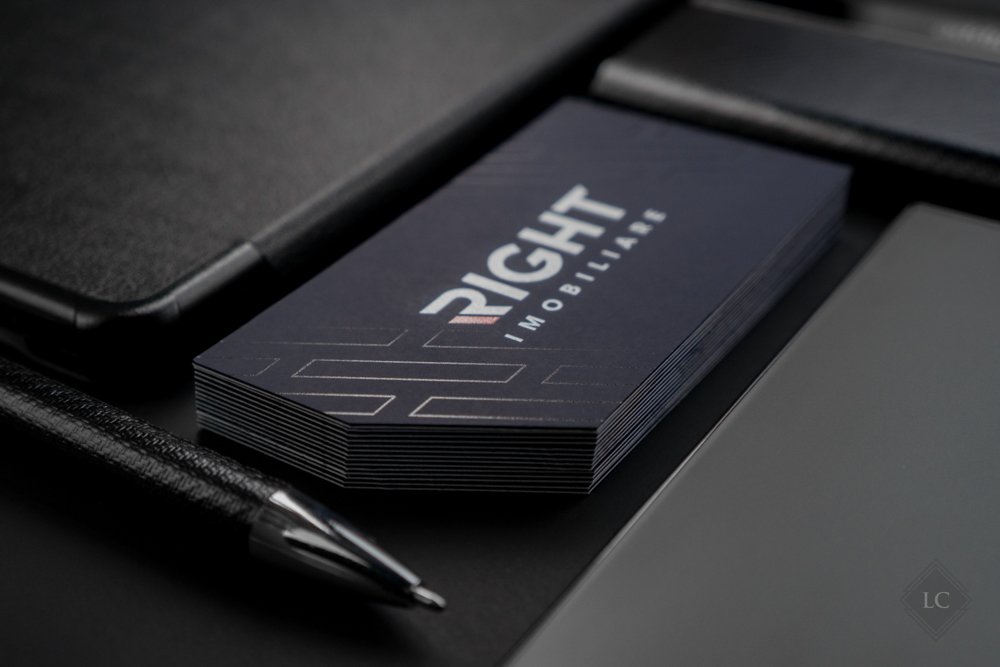 Carti de vizita premium pe carton multistrat negru mat, cu print UV in relief si folio reflexiv - verso-ul este acoperit integral cu folio reflexiv, peste care sunt aplicate initialele cu folio negru, rezultand un joc de lumini si culori extrem de spectaculos.