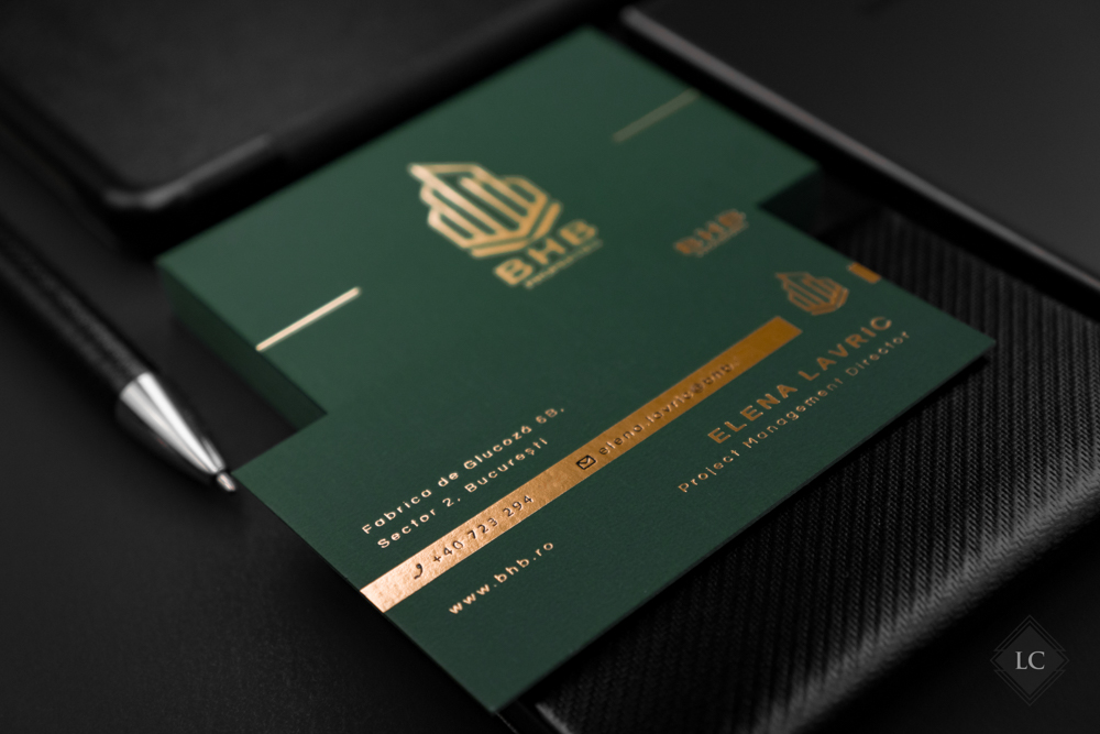 Carti de vizita premium pe carton multistrat verde, cu informatii realizate in folio auriu si logo embosat pe verso - executie premium, ideala pentru firme de constructii sau arhitectura.