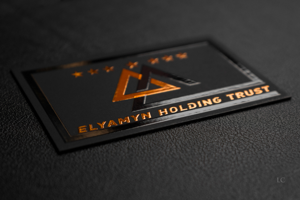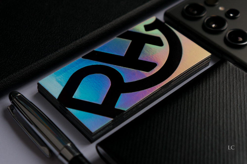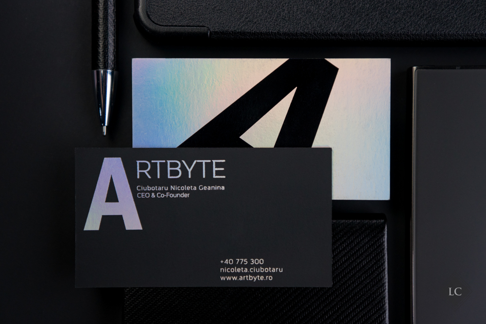 Carti de vizita premium realizate pe carton multistrat negru mat, cu folio holografic pe fata si verso integral reflexiv, cu initiala logo-ului aplicata cu folio negru pentru un contrast puternic si deosebit.