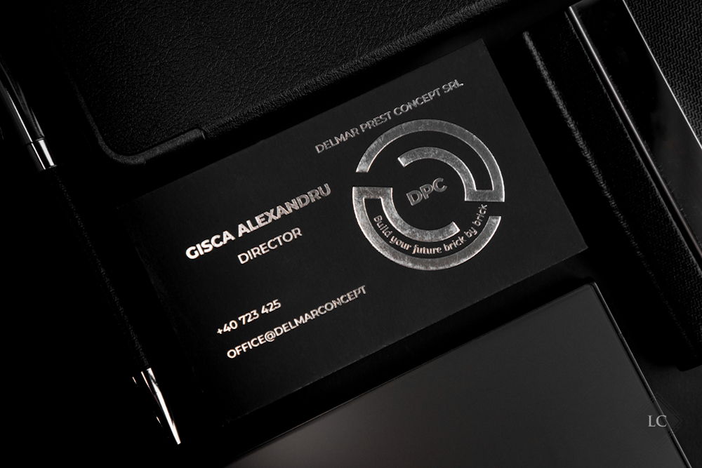 Carti de vizita premium pe carton multistrat negru mat, cu logo realizat in folio argintiu embosat pe ambele fete si texte cu reflexii metalice pentru un aspect profesionist si o imagine impecabila.