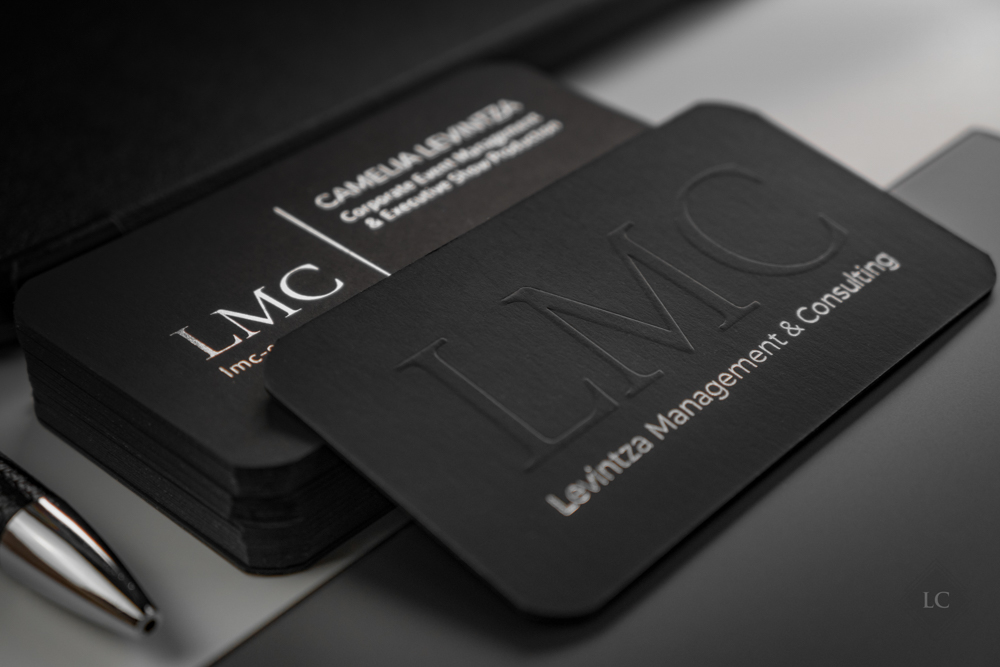 Carti de vizita premium pe carton negru mat multistrat, cu logo embosat si detalii realizate cu folio argintiu - un design minimalist, ideal pentru branduri de consultanta si servicii executive.