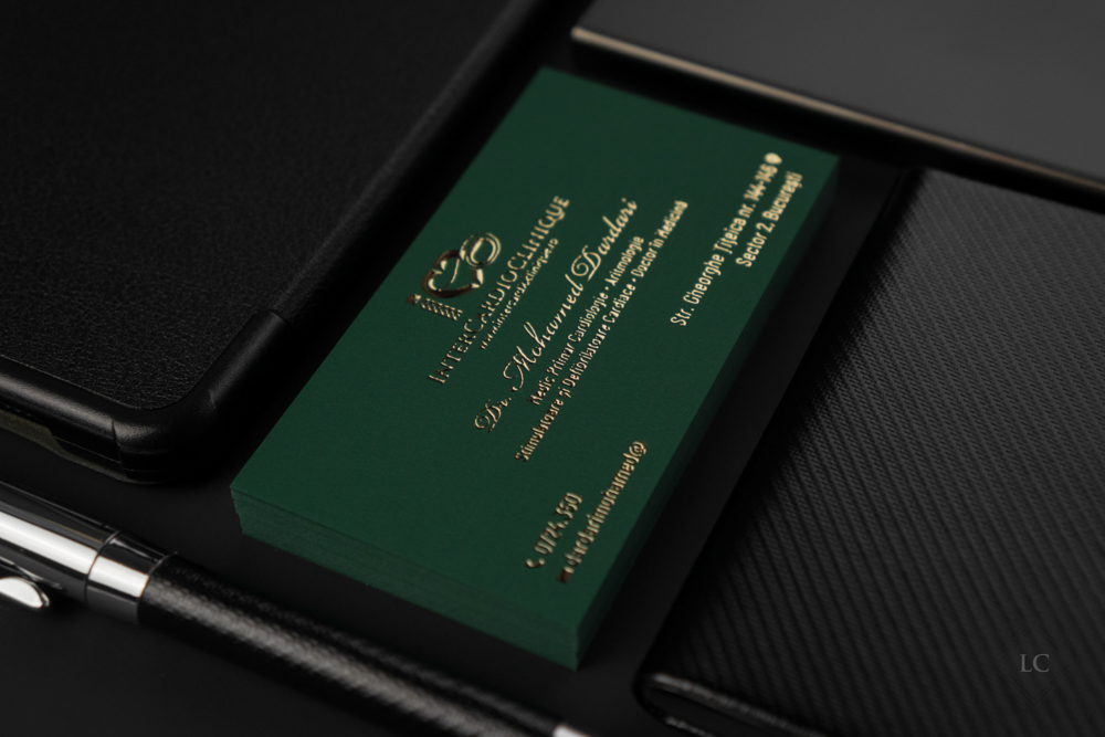 Carti de vizita pe carton verde smarald mat, cu text si simboluri realizate in folio auriu in relief - perfecta pentru medici cardiologi si profesionisti din domeniul medical care cauta o imagine memorabila.