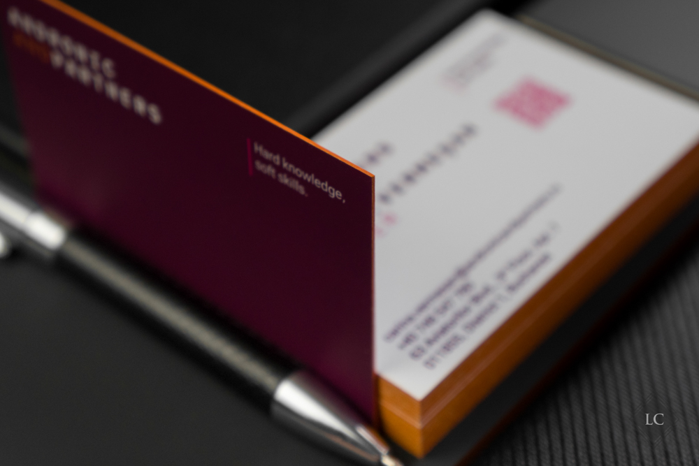 Carti de vizita premium pe carton multistrat alb, laminat soft touch pe ambele fete, cu print UV in relief si canturi vopsite manual portocaliu - ideale pentru branduri corporate sau consultanta.