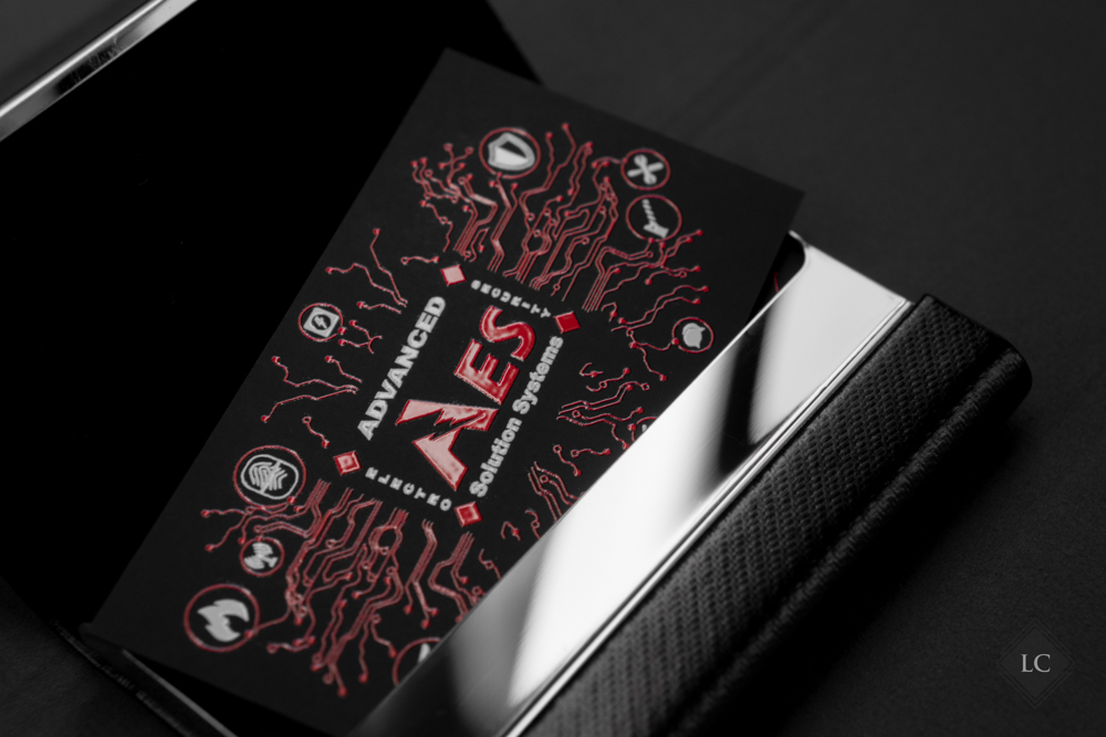 Carti de vizita premium realizate pe carton multistrat negru mat, cu logo, texte si elemente grafice printate UV in relief si finisate cu lac selectiv lucios - design high-tech, ideal pentru companii IT sau securitate.