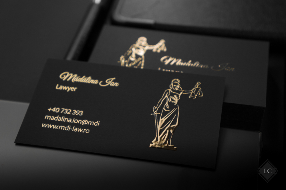 Carti de vizita premium pentru avocati, notari sau judecatori, realizate pe carton multistrat negru mat si folio auriu reliefat aplicat pe ambele fete - un design elegant, sobru si profesional.