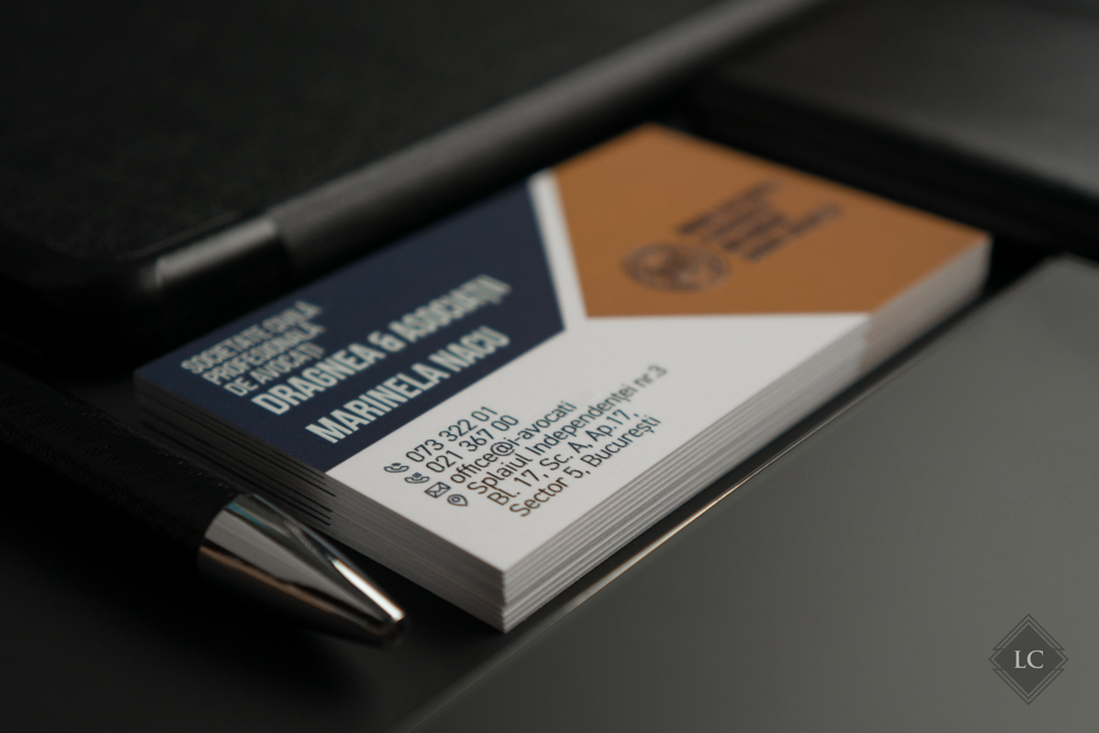 Carti de vizita premium din carton multistrat, laminate soft touch, cu print UV in relief si lac selectiv lucios aplicat pe sigla pentru un aspect profesional si durabil - ideale pentru avocati, notari sau magistrati.