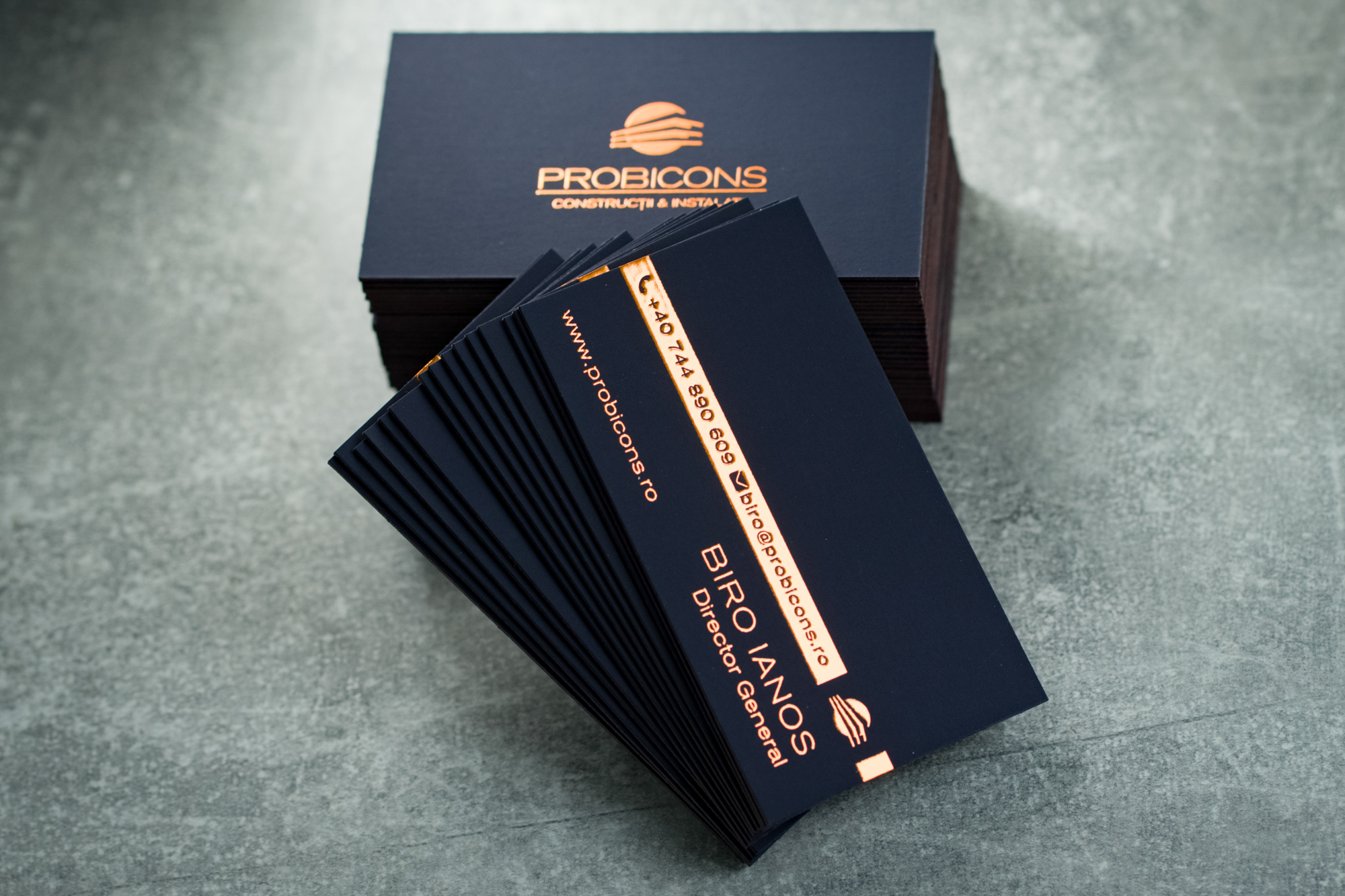 Aceste carti de vizita sunt realizate pe carton multistrat de culoare albastru inchis (mat, fin la atingere) – peste care a fost aplicat folio de culoarea cuprului.