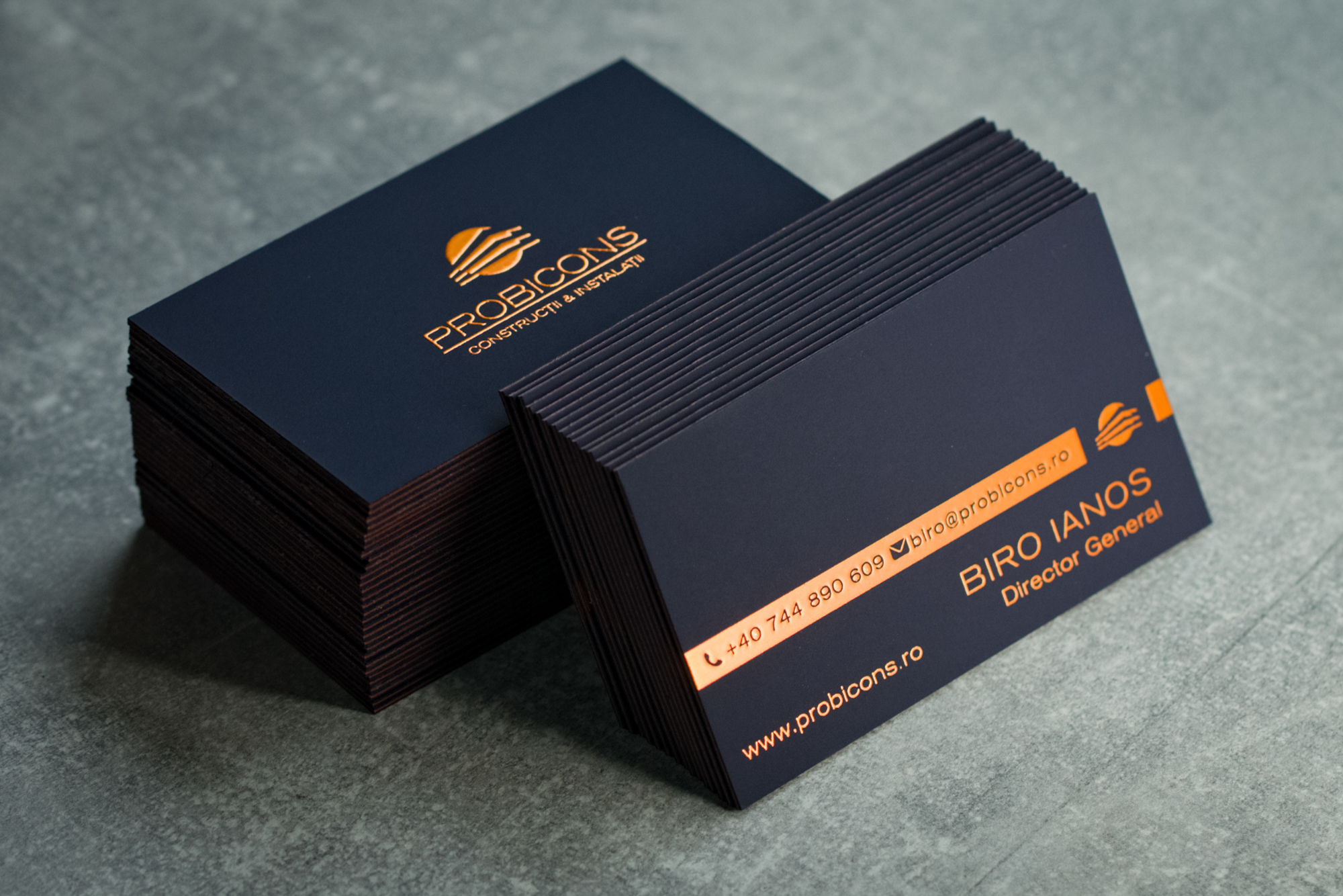 Carti de vizita albastru inchis si folio cupru – Constructii
