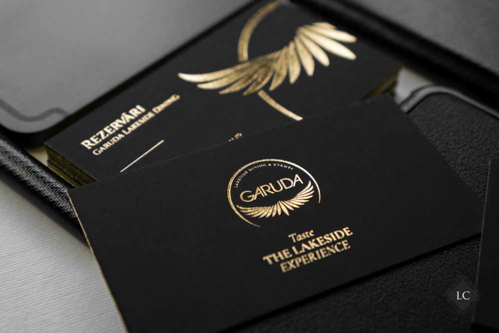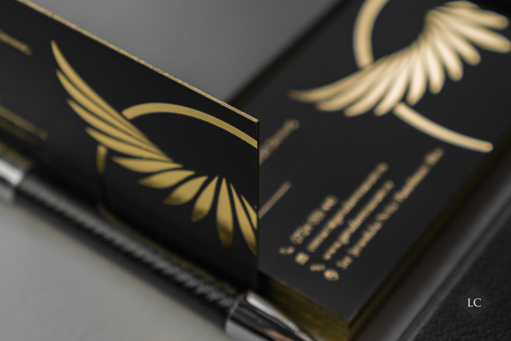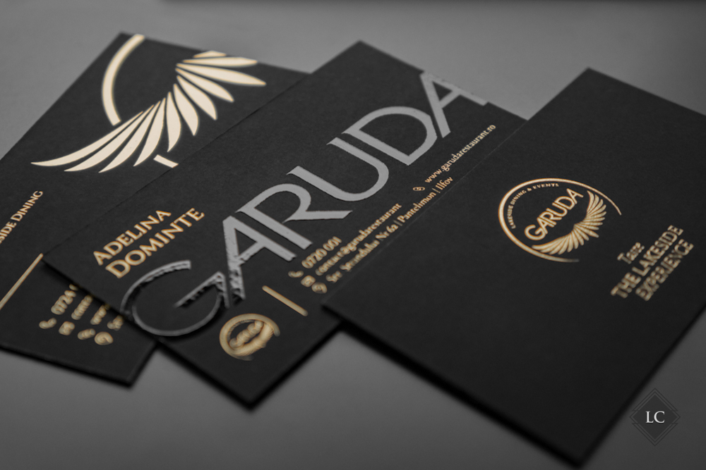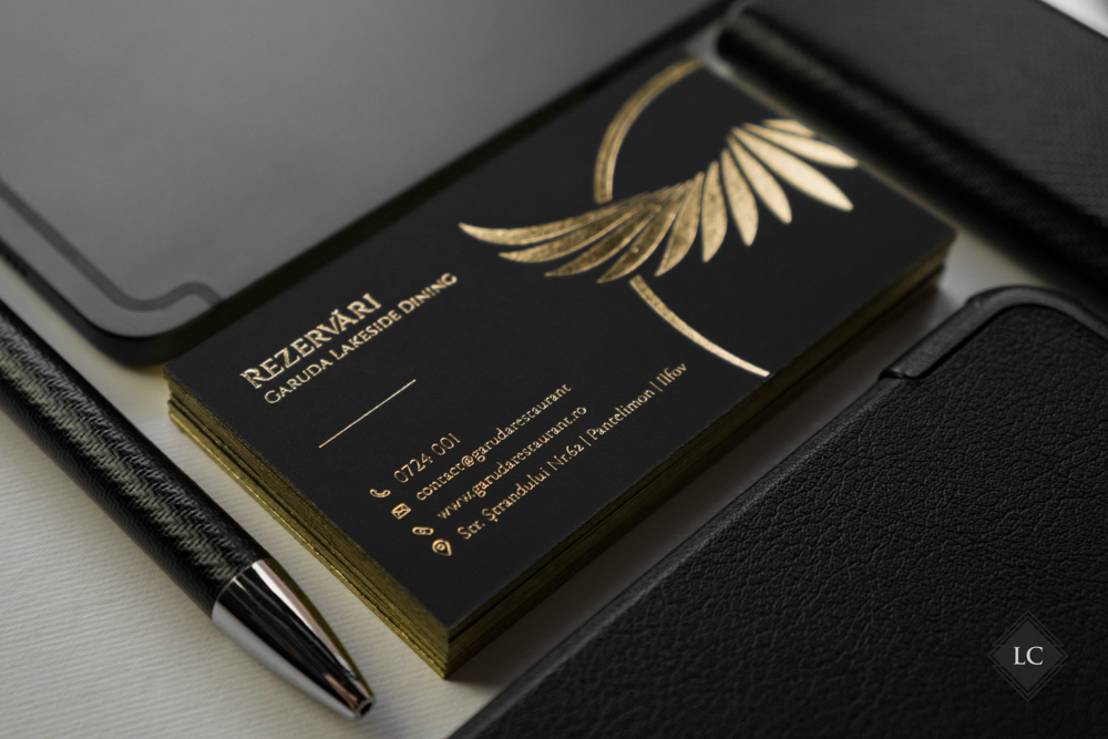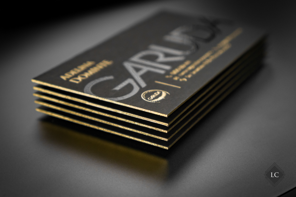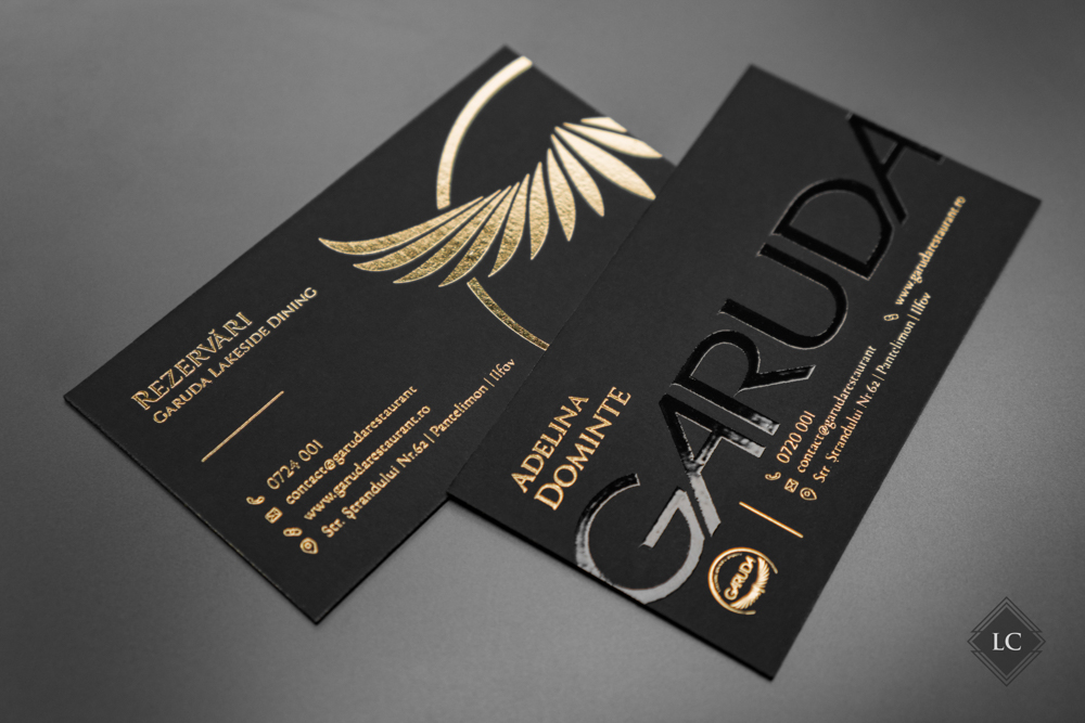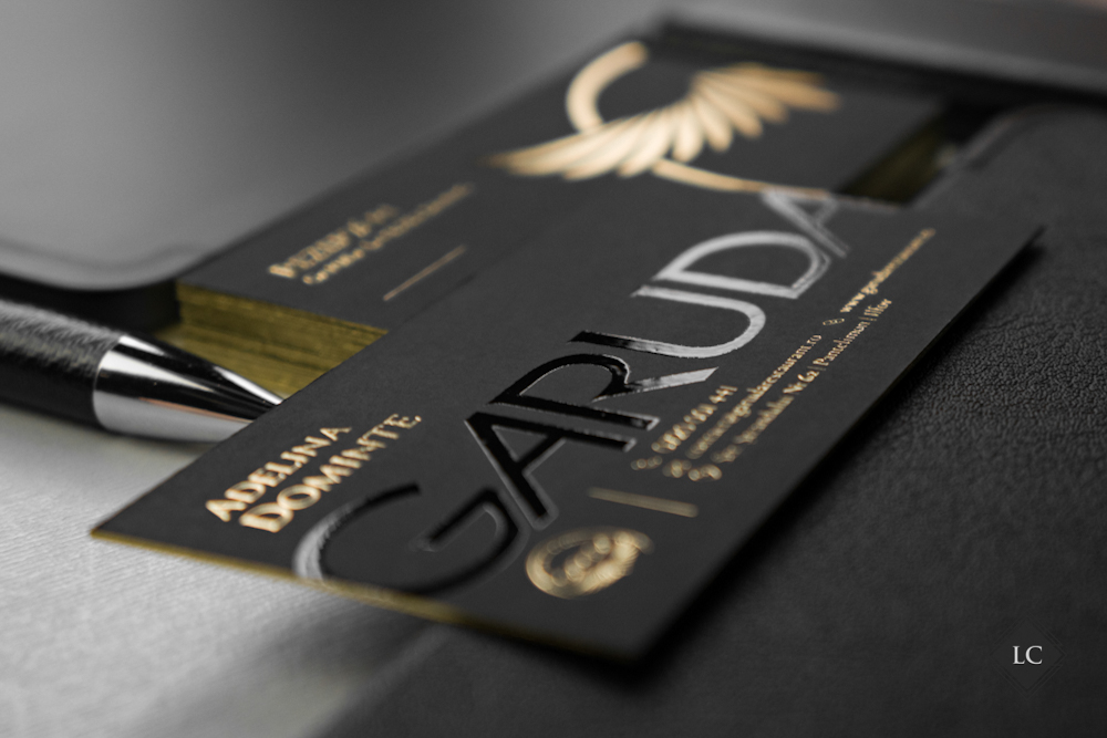 Aceste modele inedite de carti de vizita au fost realizate pe carton multistrat negru mat, compus din doua straturi lipite. Structura multistrat obtinuta ofera o baza solida si un contrast perfect pentru finisajele metalice si lucioase, iar canturile vopsite cu auriu aduc un plus de rafinament. Designul propune doua fete diferite, avand ca element comun acelasi spate – ceea ce transforma cartea de vizita intr-un instrument versatil si memorabil.
