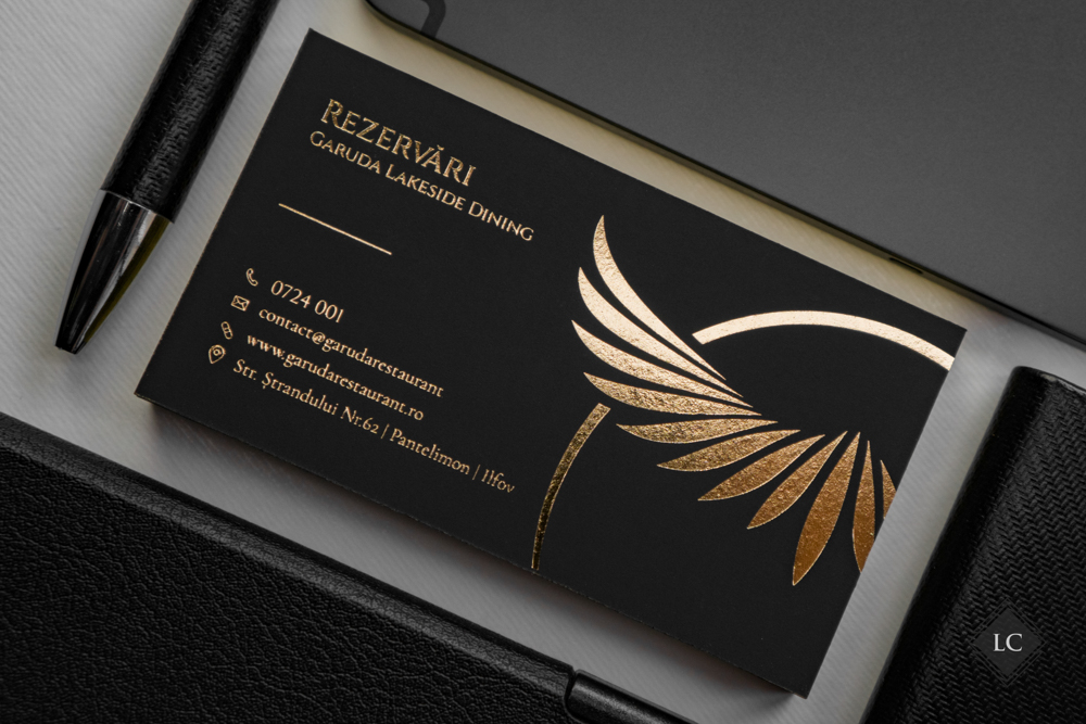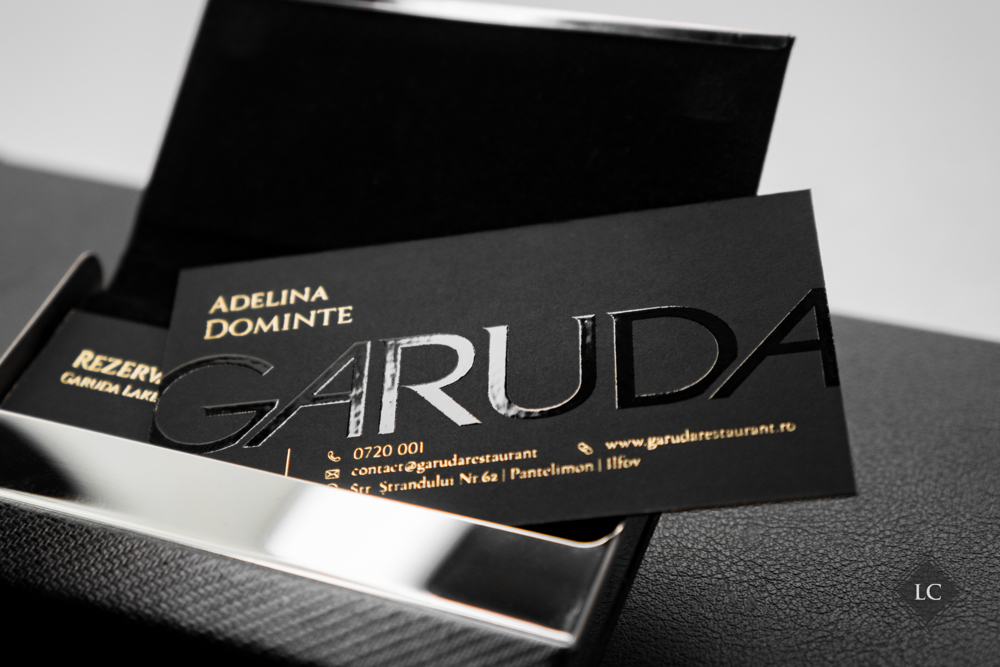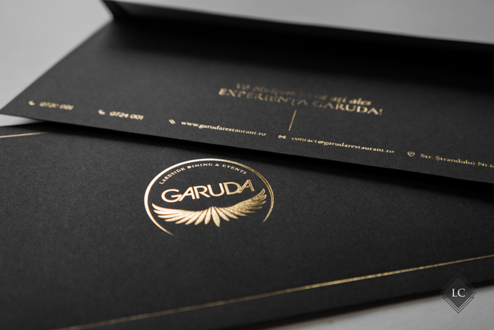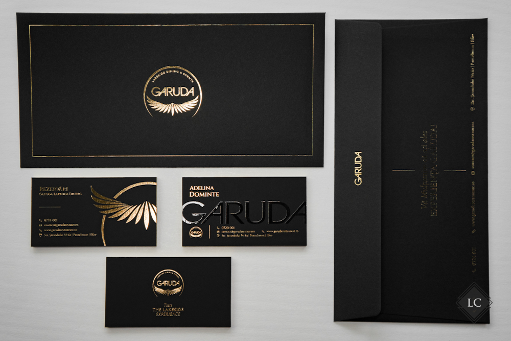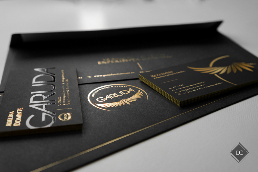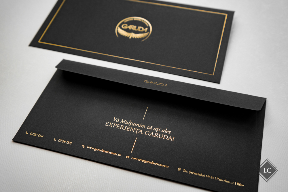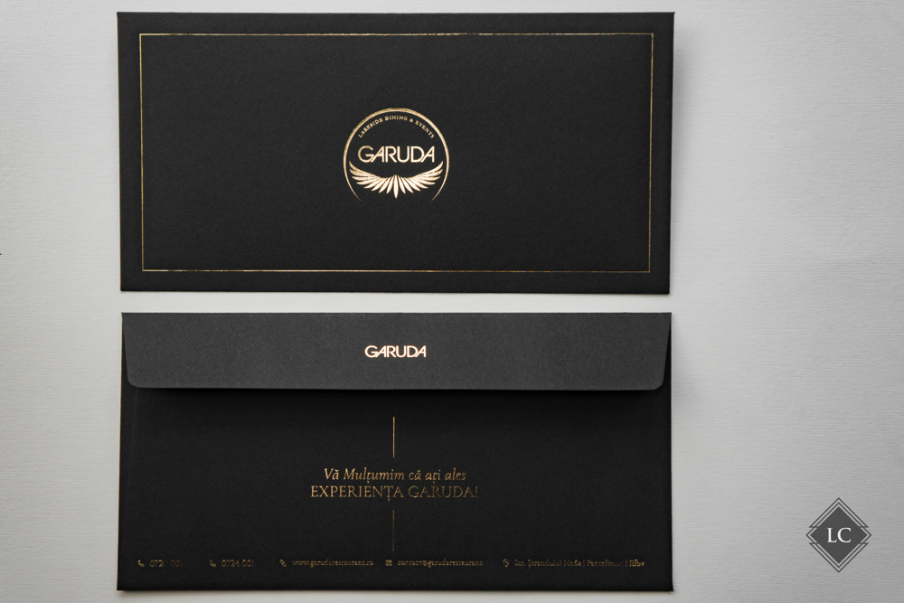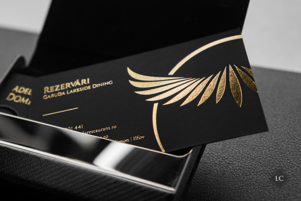 Ambele versiuni capteaza lumina in moduri diferite, oferind experiente vizuale unice. Setul este completat de plicuri negre (11×22 cm), care au fost personalizate la randul lor cu folio auriu, purtand logo-ul si numele firmei, intr-un design luxury.