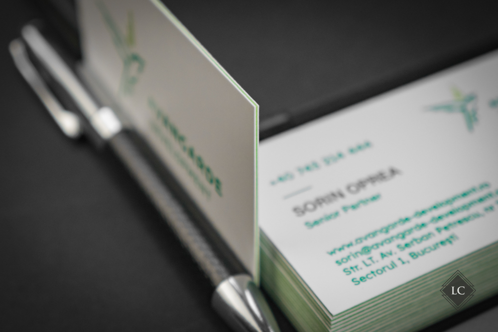 Acest model de carti de vizita este realizat pe carton multistrat compus din trei straturi: doua straturi albe exterioare si un strat verde pozitionat la mijloc. Miezul colorat este vizibil pe cant si adauga un accent subtil, dar distinctiv, care completeaza identitatea vizuala a brandului.