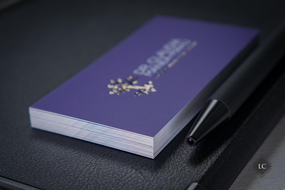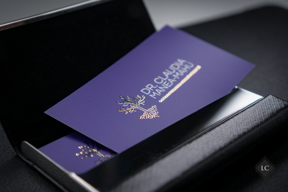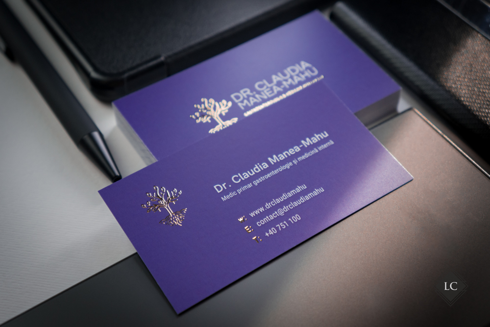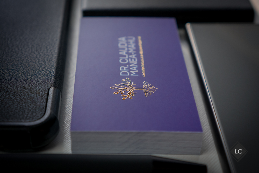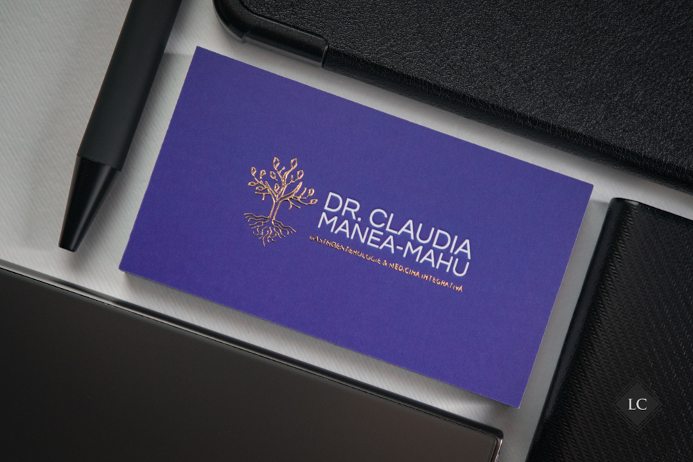 Pe verso, logo-ul si textul pozitionat sub nume sunt realizate tot cu folio auriu reliefat, pastrand coerenta estetica si consolidand identitatea vizuala. Rezultatul este o carte de vizita premium, potrivita pentru domenii precum cel medical, juridic sau de consultanta.