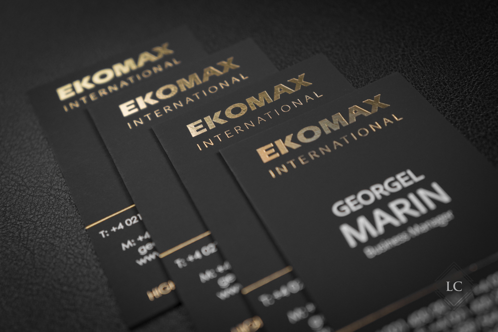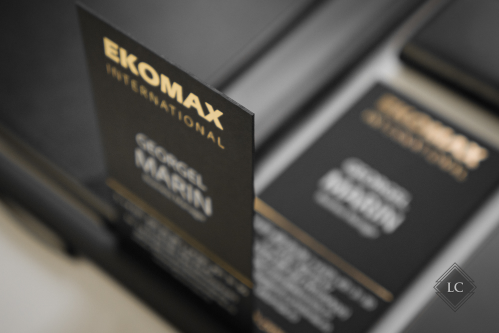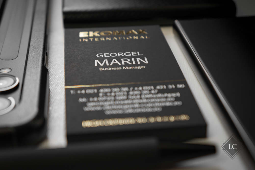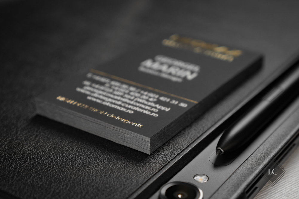 Numele companiei, domeniul de activitate si linia fina care traverseaza orizontal cartea de vizita sunt realizate cu folio auriu aplicat cu matrita la cald. Reflexia metalica adauga profunzime si autoritate, creand un echilibru perfect intre mat si lucios.
