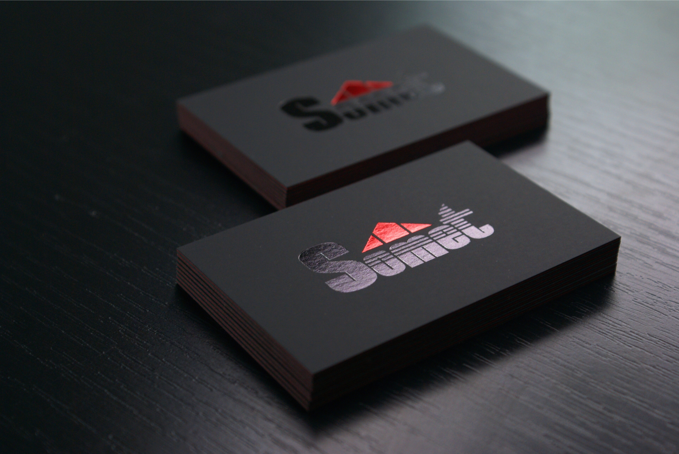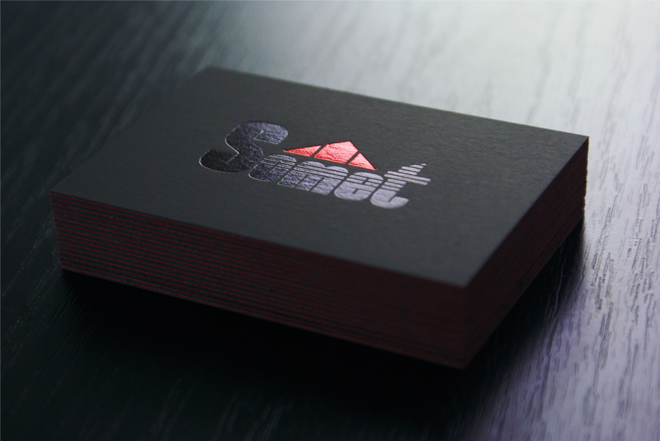 Un set de carti de vizita cu adevarat deosebit. O combinatie de finisaje cu adevarat rara in lumea cartilor de vizita. Combinatia de carton negru mat cu folie neagra lucioasa si folio rosu metalic este cu adevarat superba. Cu un aer sobru aceasta carte de vizita iese in evidenta prin calitatea suprema a cartonului – 3 straturi de carton formate din negru poros, rosu si din nou negru poros – cu o grosime totala de 1000 de grame. Grosimea cartonlui ne-a permis sa aplica folia metalica si cu lettepress – pentru un plus de finete.